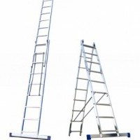 Универсальная лестница из двух частей (двухсекционная лестница) для бытового и полупрофессионального применения. Направляющие и ступени лестницы изготовлены из высоколегированного четырехугольного алюминиевого профиля. Стальные четырехугольные скобы обеспечивают плотный зажим выносной секции.