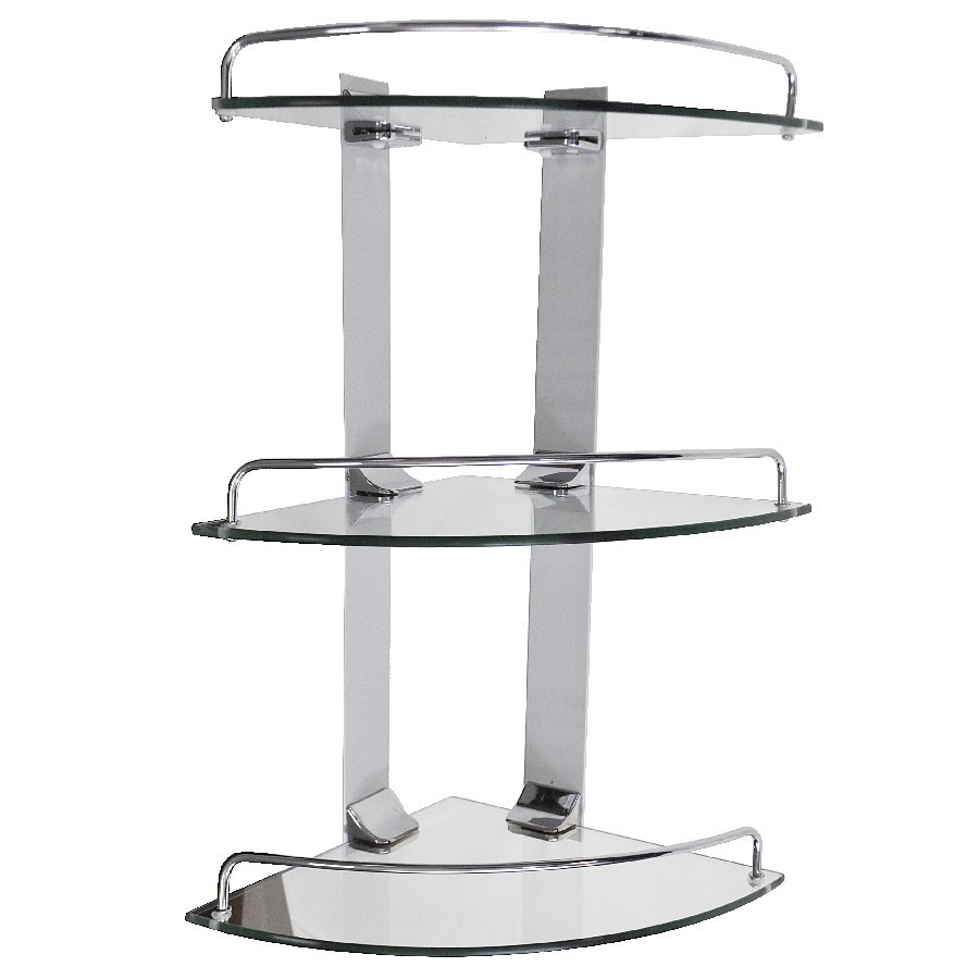 Подвесная трёхэтажная угловая полка для ванной из прочного матового стекла с полированными краями, о которые невозможно порезаться, с надежной фиксацией к стене с помощью крепления из металла с хромированным покрытием, идеально подходит для хранения различных ванных принадлежностей. Полочка изготовлена из качественного матового стекла и имеет бортик, предотвращающий падение ванных принадлежностей. Полка для ванной - функциональное и практичное решение для любого интерьера. Хромированное покрытие креплений очень стойко переносит истирание и обеспечивает зеркальный блеск изделия. Идеально подойдет не только для ванной, но и для кухни.