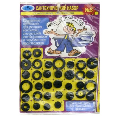 Ремонтный набор для ремнта смесителей,вентелей №8 (34шт).Универсальный набор, состоящий из колец, прокладок и клапанов. Предназначен для ремонта и установки в отечественные и импортные смесители, вентилей, гибких подводок, водяных счетчиков и кран-букс различной модификации. Купить в нашем магазине