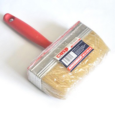 натуральная светлая щетина, пластмассовый корпус. Предназначена для проведения отделочных работ на большой площади с применением всех видов лакокрасочных материалов. Кисть изготовлена в пластмассовом корпусе, применена натуральная светлая щетина. Для продления срока службы инструмента используется металлический бандаж. Ручка изготовлена из пластмассы, имеет отверстие для подвески и оснащена крючком для крепления кисти на краю ведра.