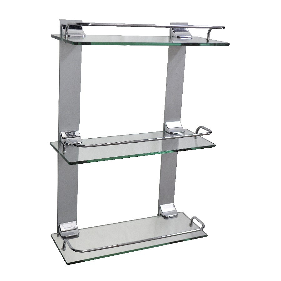 Полка стеклянная, настенная, трёхэтажная. Подвесная трёхэтажная настенная полка для ванной из прочного стекла толщиной 5 мм с полированными краями, о которые невозможно порезаться, с надежной фиксацией к стене с помощью крепления из металла с хромированным покрытием, идеально подходит для хранения различных ванных принадлежностей. Полочка изготовлена из качественного стекла и имеет бортик, предотвращающий падение ванных принадлежностей. Полка для ванной - функциональное и практичное решение для любого интерьера. Хромированное покрытие креплений очень стойко переносит истирание и обеспечивает зеркальный блеск изделия. Идеально подойдет не только для ванной, но и для кухни. Изделие крепится к стене с помощью дюбелей и саморезов (входят в комплект).