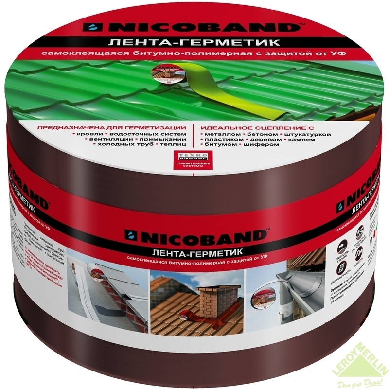 НИКОБЕНД Лента-герметик 10смх3м коричневый (самоклеящаяся). Лента-герметик NICOBAND - это удобный способ герметизации различных трещин и стыков. Применяется также для изоляции примыканий, ремонта кровельных покрытий крыш и водосточных систем. Специальная УФ защита ленты-герметика увеличивает срок ее эксплуатации вне помещений, а ассортимент цветовых решений подойдет под любую кровлю.Купить такую ленту-герметик в Волгограде можно в нашем интернет-магазине по цене, указанной выше.