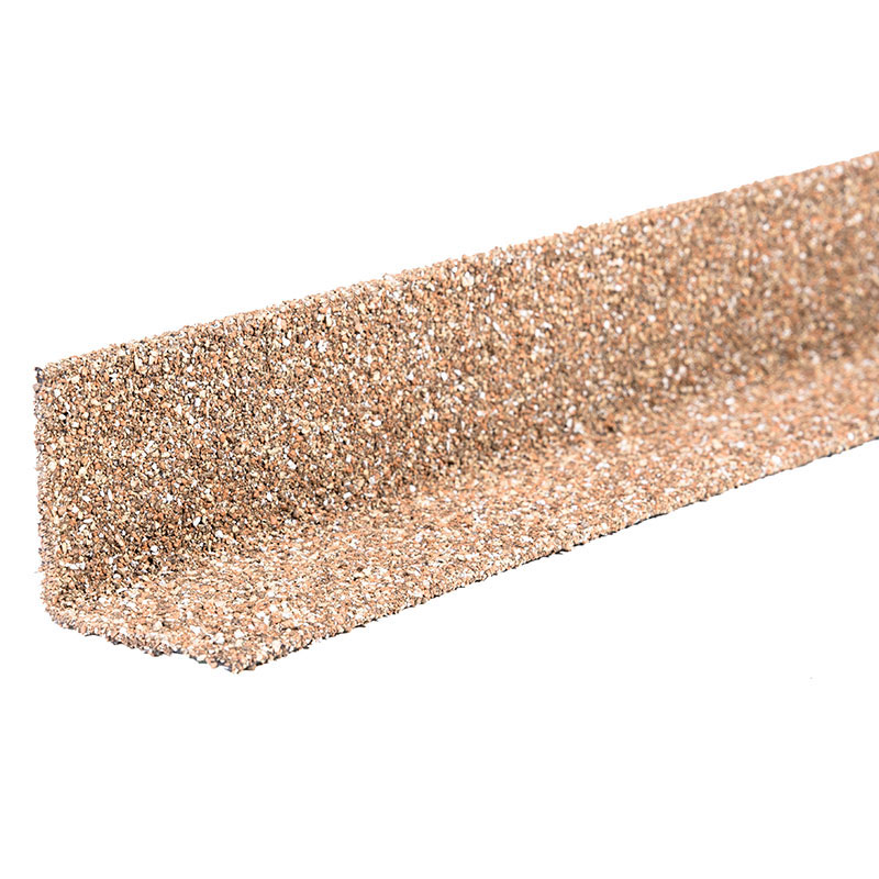 Внутренний уголок изготовлен из высокопрочного стального листа толщиной 0,45 мм. С обоих сторон изделие покрыто алюмоцинковым сплавом. Покрытие внешней стороны – базальтовый гранулят. Уголок не подвержен коррозии и не будет окисляться даже в месте среза при монтаже, а также в случае появления царапин на слое.