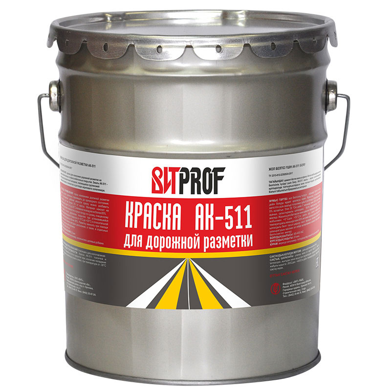 КРАСКА ДЛЯ ДОРОЖНОЙ РАЗМЕТКИ АК-511. НАЗНАЧЕНИЕ: краска для нанесения дорожной разметки на цементобетонные и асфальтобетонные покрытия. Эмаль АК-511 - это одноупаковочный материал, являющийся суспензией наполнителей и пигментов в растворе акрилового сополимера. СПОСОБ ПРИМЕНЕНИЯ: перед нанесением дорожной разметки краску нужно тщательно перемешать до однородного состояния. Для достижения рабочей вязкости краску можно разбавить толуолом, но не более 5% от массы. Материал наносят на поверхность при t° от 5 до 30 °С и влажности воздуха не более 85%. Разметка должна наносится в сухую погоду по сухому, очищенному от грязи и пыли дорожному покрытию при установившейся температуре воздуха и покрытия от +5°С до +30°С и относительной влажности воздуха не более 85%. Разметку наносить при помощи специальной техники методом распыления, а также, в отдельных случаях, кистью либо валиком. РАСХОД: 300-400 г/м2. ВРЕМЯ ВЫСЫХАНИЯ: 20 мин. СОСТАВ: акриловый сополимер, наполнители, целевые добавки. ГАРАНТИЙНЫЙ СРОК ХРАНЕНИЯ: 6 месяцев с даты изготовления. МЕРЫ ПРЕДОСТОРОЖНОСТИ: Краска АК-511 токсична и огнеопасна. Хранить в плотно закрытой таре, исключив попадания на нее прямых солнечных лучей и влаги, при температуре от -30°С до +40°С. БЕРЕЧЬ ОТ ОГНЯ!
