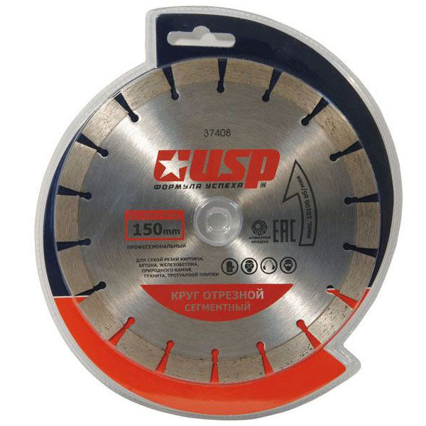 Профессиональный. Для сухой резки кирпича, бетона, железобетона, природного камня, гранита, тротуарной плитки при совместном использовании с углошлифовальными машинами и электрическими плиткорезами. Обеспечивает отличную производительность и не требует водяного охлаждения. Оптимальная твердость режущей части и прочность соединения металлической связки с алмазом достигаются методом горячего спекания, что позволяет увеличить скорость реза до 20 % и ресурс диска — до 50 %. Материал: тело круга из высококачественной инструментальной стали, режущая кромка с аппликацией алмазной крошки в высокой концентрации.