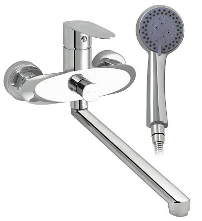 Смеситель в ванную/душевую комнату: латунный корпус, хромированный, с длинным плоским изливом.