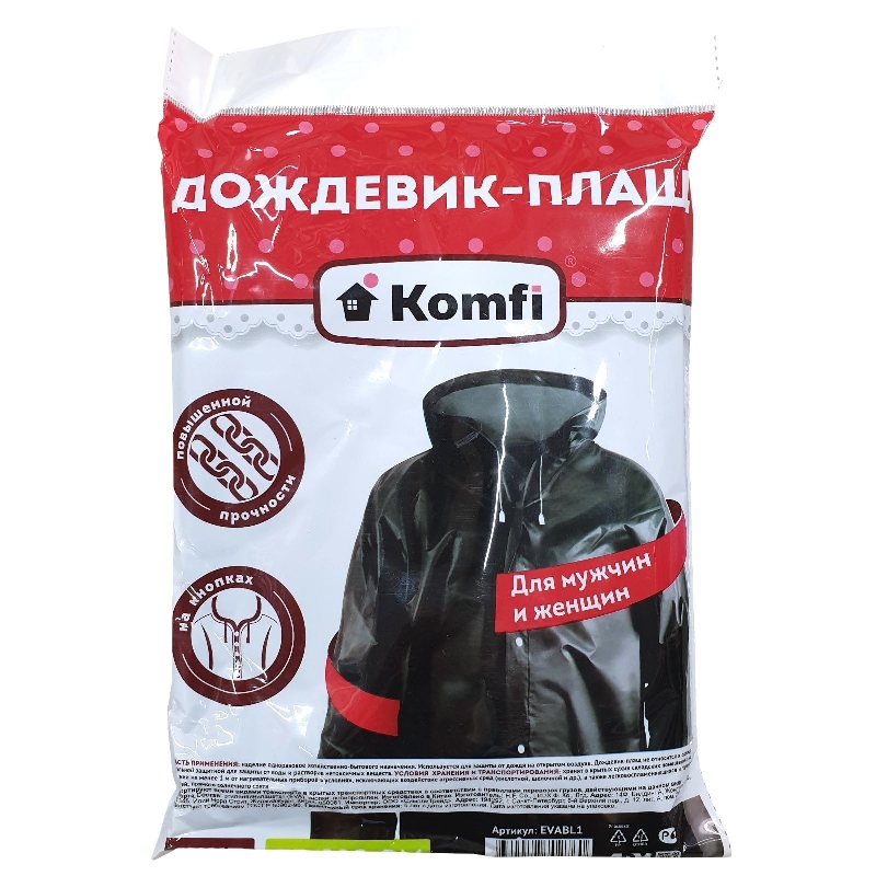 Дождевик с капюшоном Komfi черный, EVA, на кнопках, 110 мк, идеально подойдет для отдыха на природе, рыбалке, пикника, а также для городских прогулок.