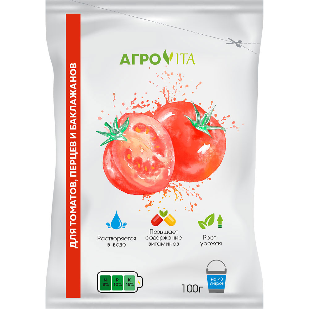 Удобрение Агровита Для томатов, перцев и баклажанов 100гВысокоэффективное водорастворимое комплексное удобрение. Предназначено для полива под корень (корневая подкормка) и опрыскивания (внекорневая подкормка) томатов, перцев и баклажанов