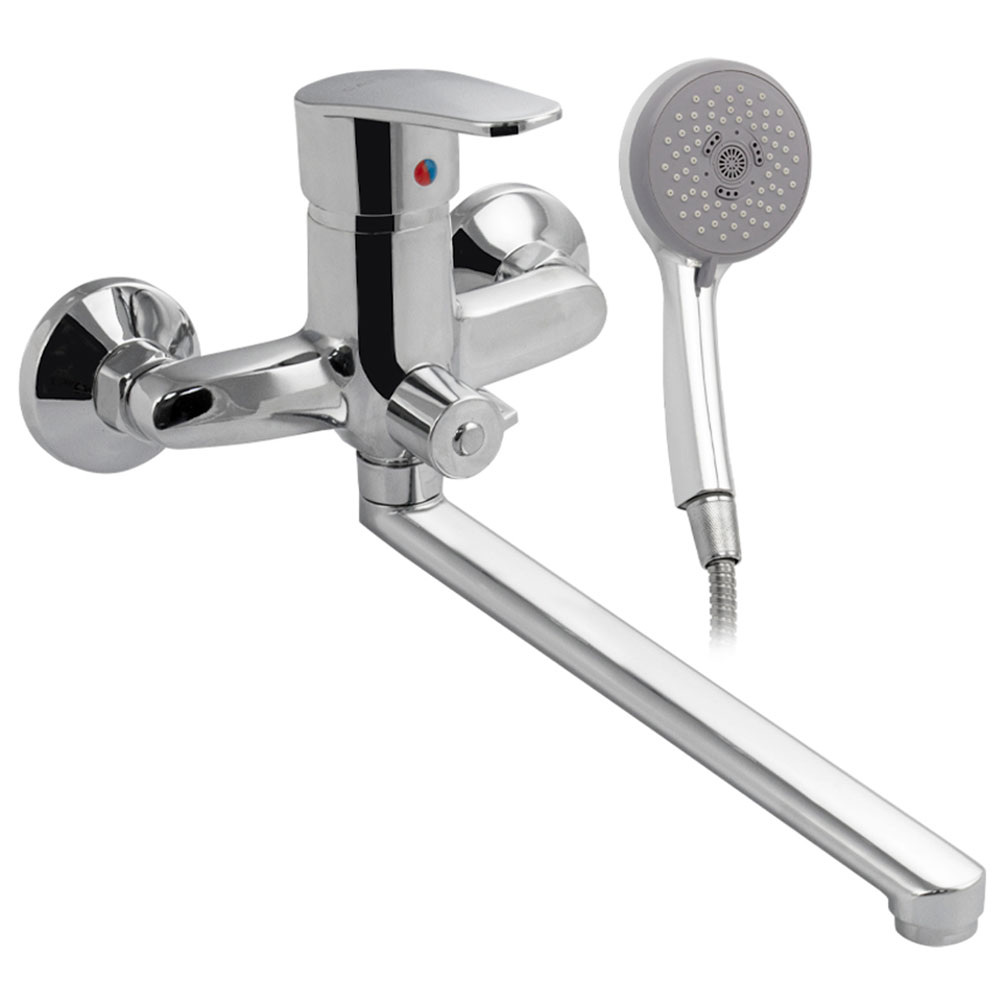 Смеситель хромированный в ванную / душевую комнату, с длинным плоским изливом, шаровый, с дивертором м/к на