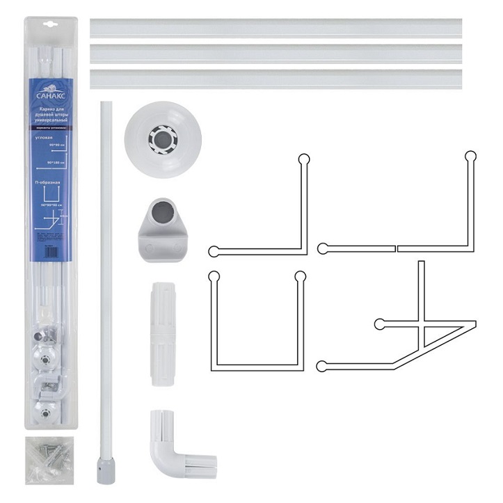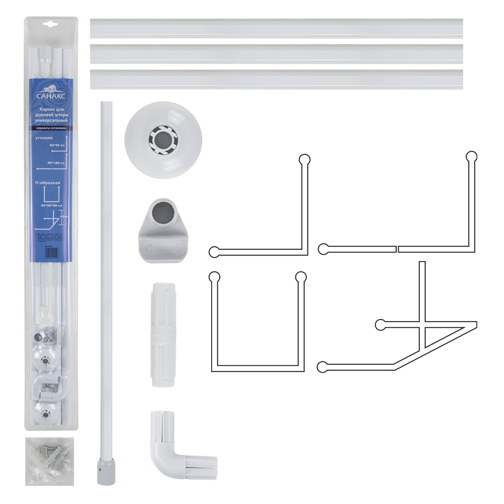 Карниз в ванную угловой, белый. Универсальный, П и Г - образная система, изготовлена из алюминиевых трубок и