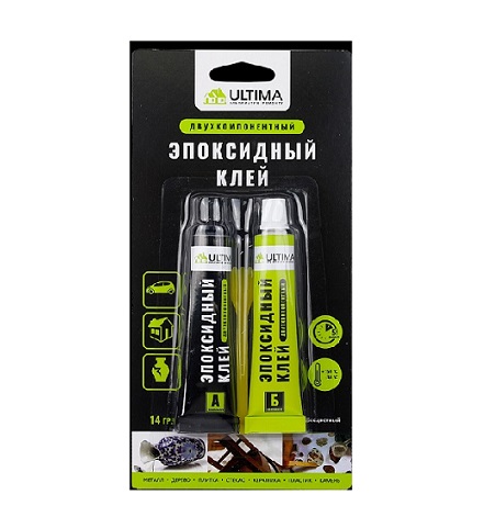 ULTIMA – двухкомпонентный клей на основе эпоксидной смолы. Применяется для склеивания металлов и их сплавов, пластика, керамики, стекла, декоративно-облицовочных и других материалов, а также для заделки пор, трещин, раковин при ремонте домашнего инвентаря, автомобилей.