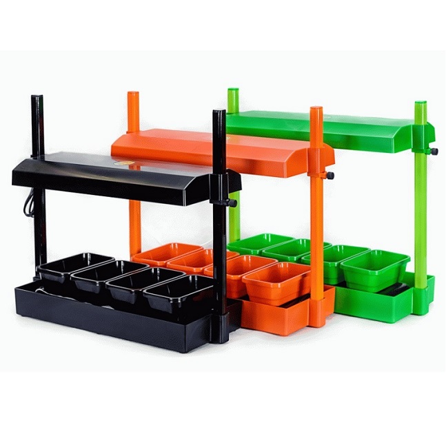 Компактная переносная установка со светодиодным светильником оснащена самополивом, который обеспечивается капиллярным матом, входящим в комплект. Также в комплект входят 4 съемных лотка и 10 многоразовых стаканов для рассады со съемным дном.