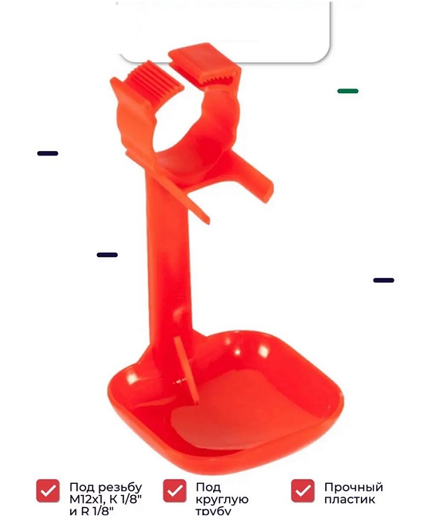Используйте для создания ниппельной системы поения для птиц и грызунов. Пластик — прочный и простой в уходе материал. Крепление под круглую трубу. Каплеуловитель предназначен для установки на круглой трубе с наружным диаметром 25 мм совместно с ниппельными поилками с резьбой М12х1, К 1/8" и R 1/8". Без ниппелей.