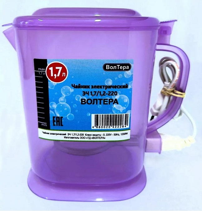 Чайник бытовой изготовлен из пищевого пластика, цвет корпуса — фиолетовый.