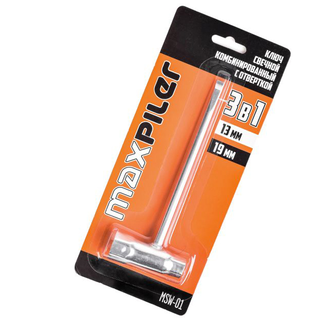 Ключ свечной комбинированный MAXPILER MSW-01 (13 мм, ключ 19 мм + отвертка)Ключ свечной комбинированный MAXPILER MSW-01 (13 мм, 19 мм + отвёртка) — универсальный инструмент 3 в 1. Он объединяет два гаечных ключа: 13 мм и 19 мм, и отвёртку.