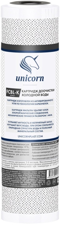 Изготовлен из активированного угля по технологии карбонблок. Надёжно очищает воду от хлора и его соединений, пестицидов, гербицидов и других тригалогенметанов, механических примесей размером более 1 мкм. Устраняет мутность и неприятный запах, улучшает вкус воды, при этом сохраняется природная структура воды и полезный минеральный состав.