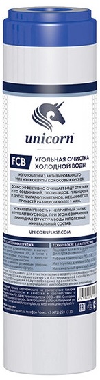 Изготовлен из активированного угля из скорлупы кокосовых орехов. Надёжно очищает воду от хлора и его соединений, пестицидов, гербицидов и других тригалогенметанов, механических примесей размером более 1 мкм. Устраняет мутность и неприятный запах, улучшает вкус воды, при этом сохраняется природная структура воды и полезный минеральный состав.