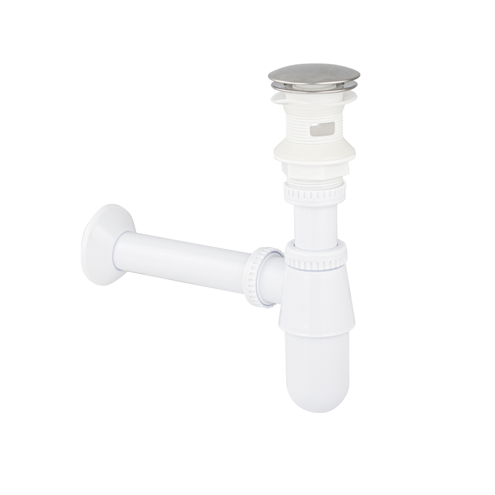 Сифон для раковины из высокопрочного АБС-пластика, белый, с системой "Клик-Клак" — это эстетичное и функциональное устройство для подключения раковины к системе канализации. Бутылочная модель изготовлена из пластика, что обуславливает ее высокую прочность и долговечность. Она устойчива к перепадам температур, поэтому в раковину можно сливать кипяток. Белая поверхность не требует особого ухода – достаточно просто протереть. Изделие комплектуется гофрированной трубой с выходом для канализации 32 мм.