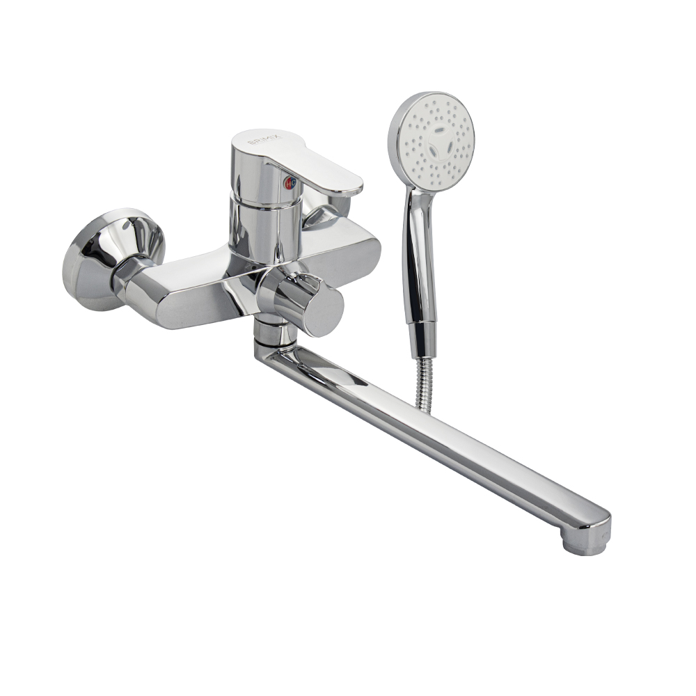 Смеситель из высокопрочного АБС-пластика, хромированный, для ванной/душевой комнаты с длинным, плоским изливом, литой корпус, шаровый с дивертором м/к на корпусе. Картридж d = 40 мм, литая ручка, хромированная, аэратор для экономии воды, хромированные чашки и эксцентрики.