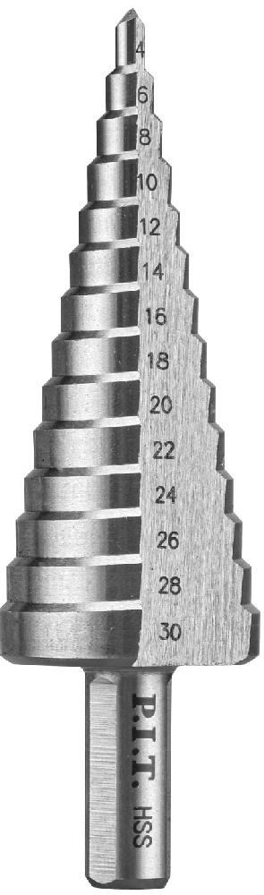 Коническая ступенчатая форма сверла позволяет сверлить отверстия разного диаметра без смены оснастки и идеальна для рассверливания отверстий меньшего диаметра на больший.