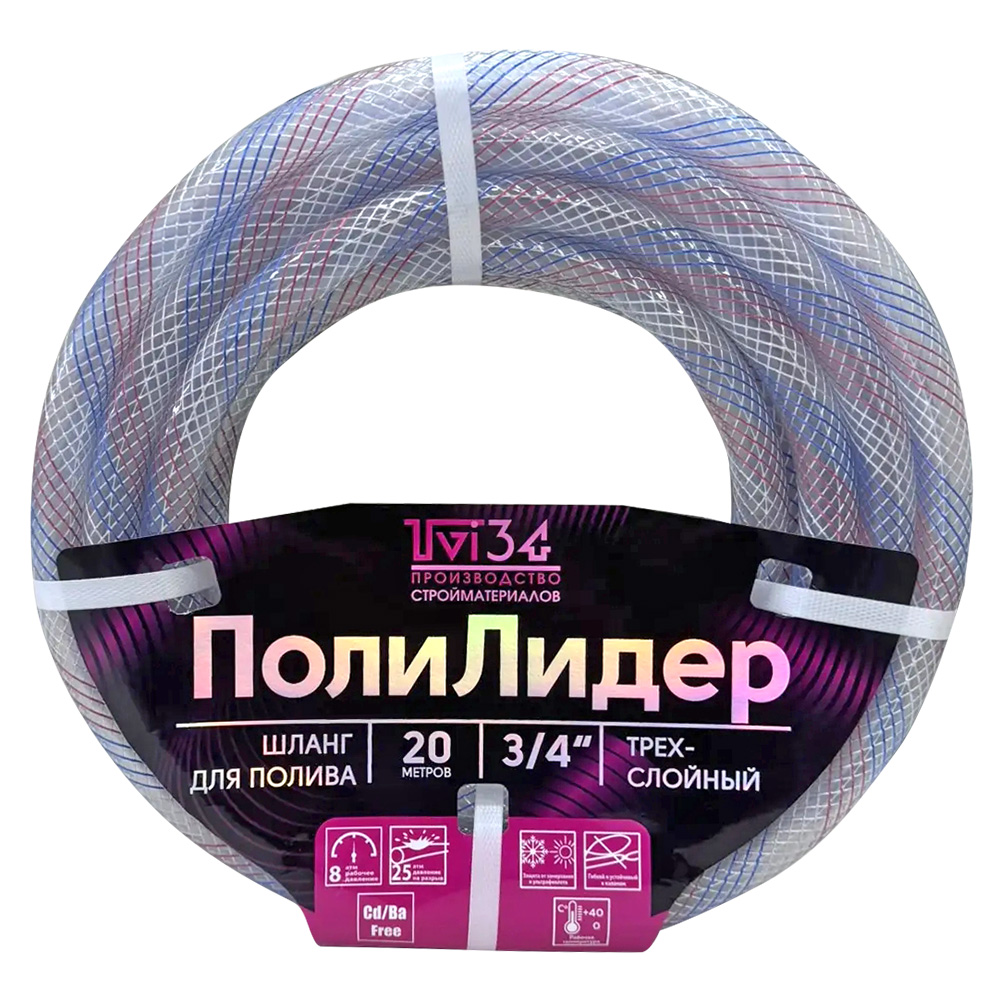Шланг поливочный армированный, ПолиЛидер 20 метров, диаметр 3/4". Рабочее давление 8 атм.