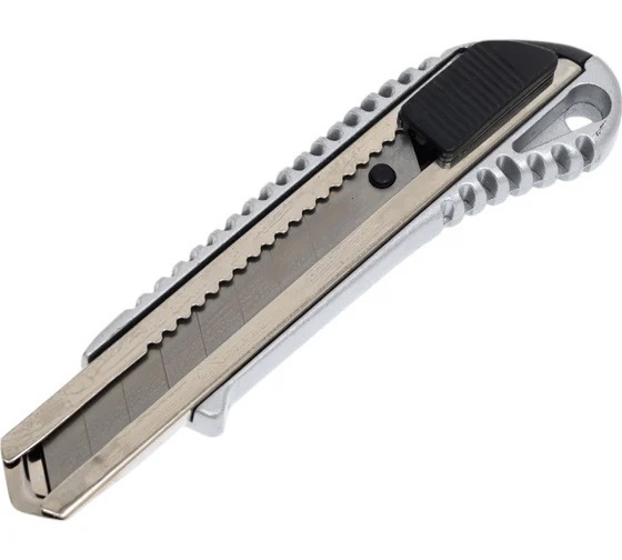 Нож с выдвижным лезвием. Облегченный корпус из цинкового сплава специальной формы для надежного захвата. Направляющая лезвия и его держатель изготовлены из нержавеющей стали. Используемые в конструкции материалы обеспечивают длительный срок службы. В комплекте 1 лезвие с отламывающимися сегментами.
