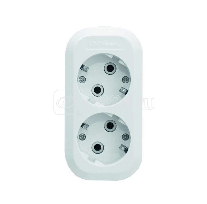 Розетка двойная с заземлением, открытой проводки, цвет — белый. Тип зажимов: винтовой.